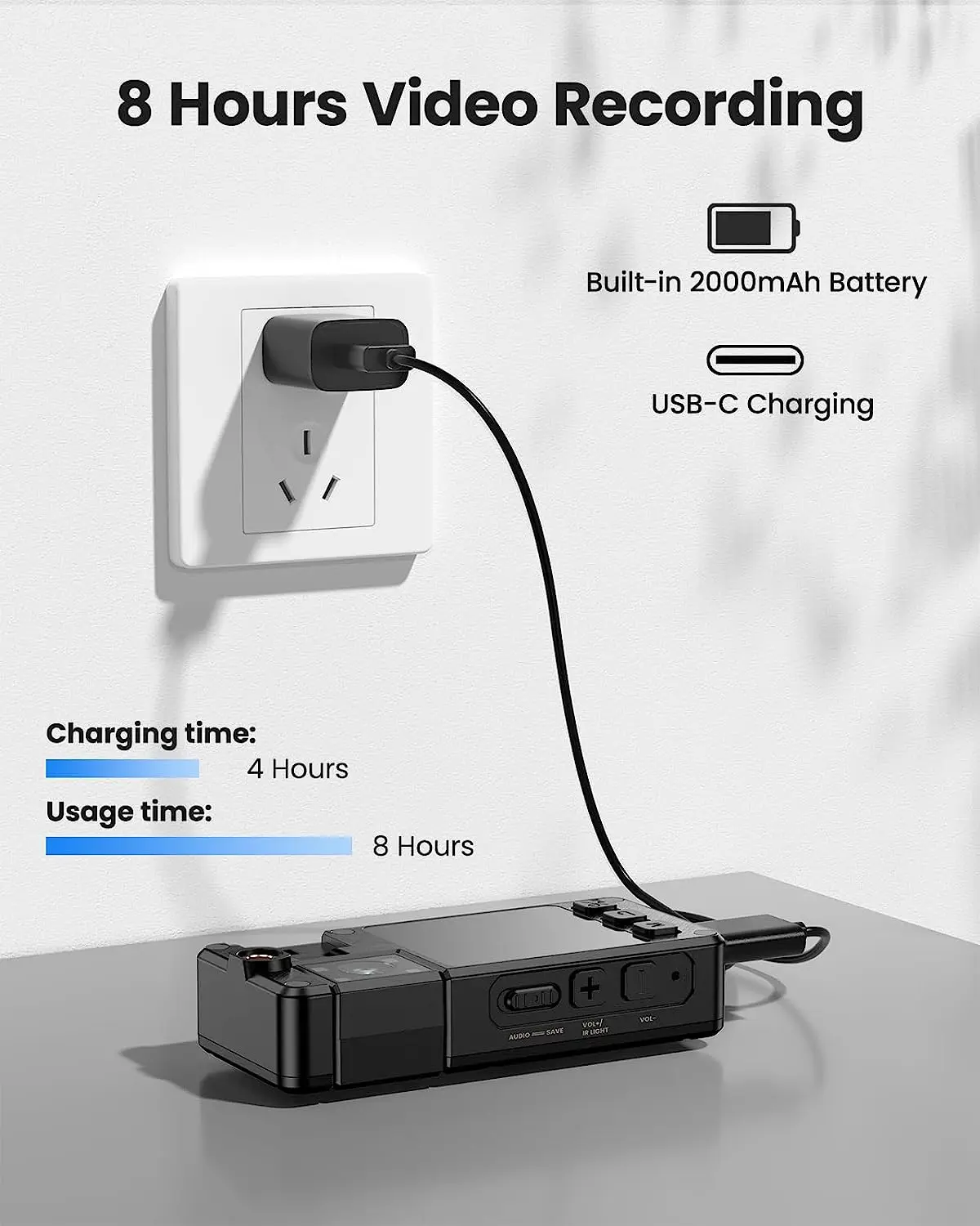 🔋 Акумулятор 2000 мА·г — до 8 годин безперервного запису або до 30 днів у режимі очікування. Підтримується запис під час зарядки.