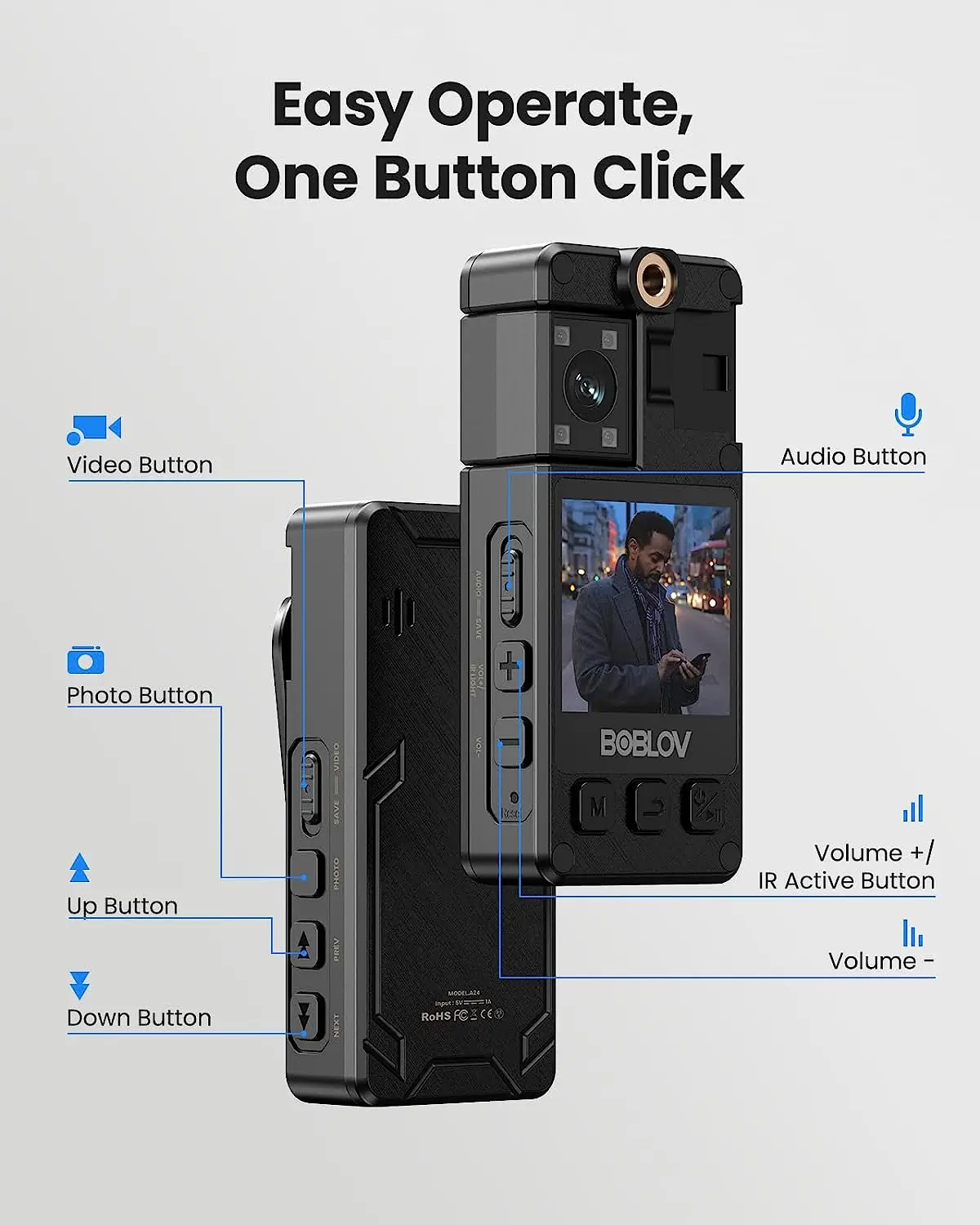 Boblov A24 — це універсальна нагрудна камера з поворотним об'єктивом, високою якістю запису та розширеним функціоналом. Вона ідеально підходить для використання в охороні, на службі, у транспорті, під час подорожей або в повсякденному житті. Компактний дизайн, зручне керування і міцний корпус роблять її надійним вибором для запису важливих моментів у будь-яких умовах.